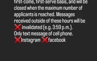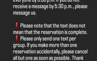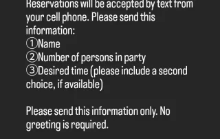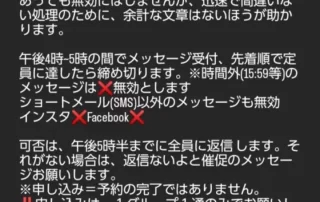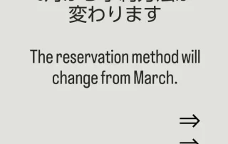 3月から、予約は携帯番号のショートメール(SMS)のみとなります。前日16時からの受付先着順(17時受付終了)です。 ①名前 ②人数 ③希望時間(第二希望もあれば) この3つだけ書いて送ってください。 あいさつ文やよろしく~等も何も要りません。あっても無効にはしませんが、迅速で間違いない処理のために、余計な文章はないほうが助かります。 前日、午後4時~5時の間でメッセージ受付、先着順で定員に達したら締め切ります。※時間外(15:59等)のメッセージは❌無効とします 携帯ショートメール(SMS)以外のメッセージも無効です インスタ❌Facebook❌ 可否は、午後5時半までに全員に返信します。それがない場合は、返信ないよと催促のメッセージお願いします。 [...]